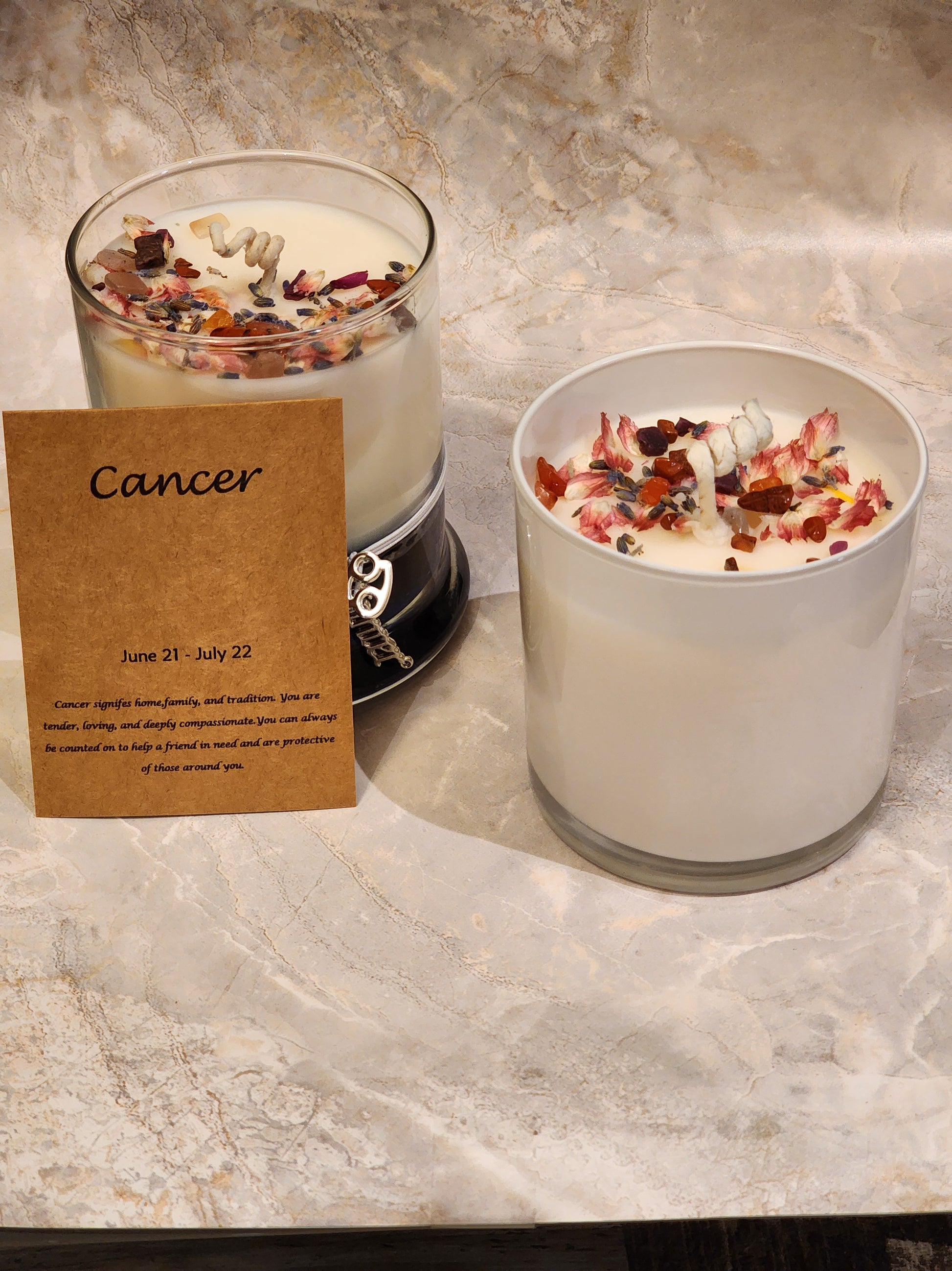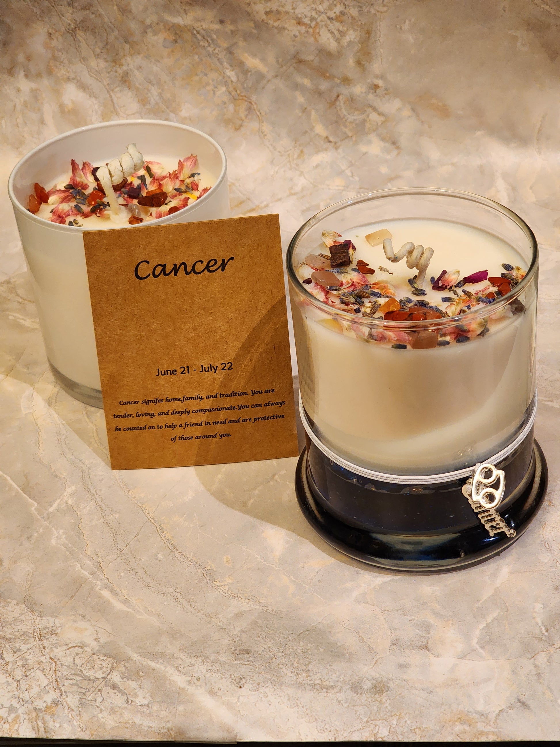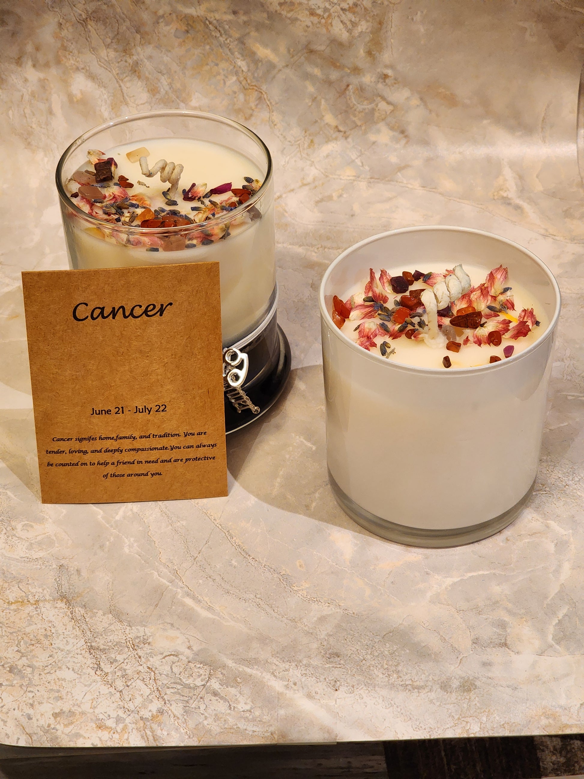 - A soy wax top, adorned with flowers and crystals specific to each zodiac sign.