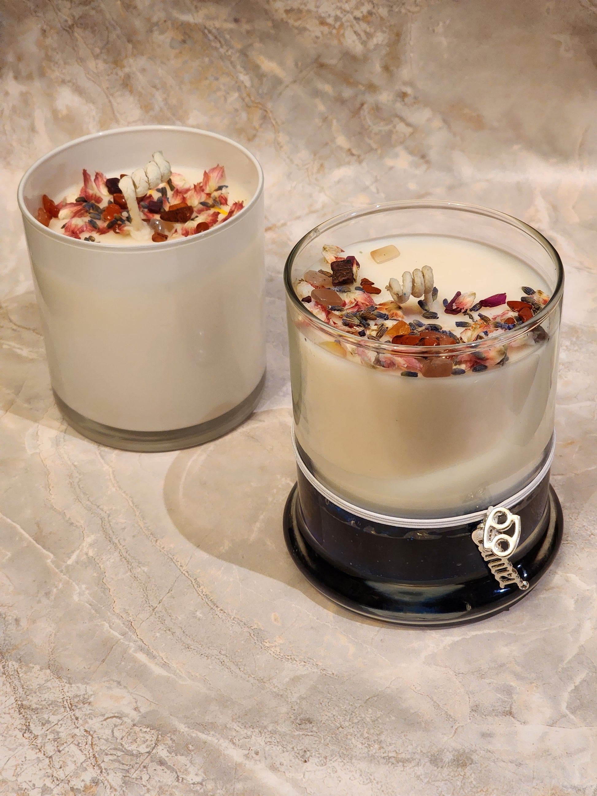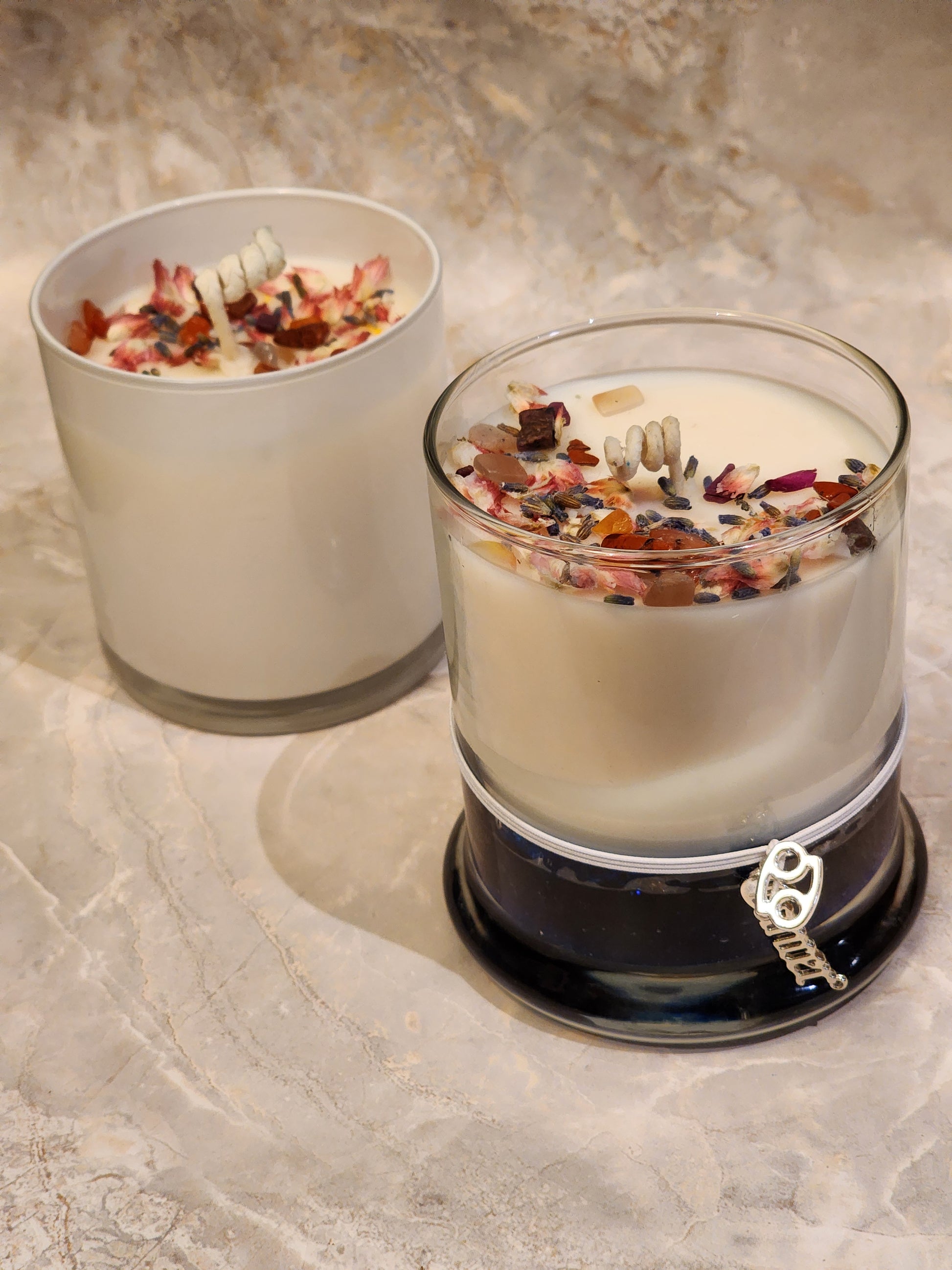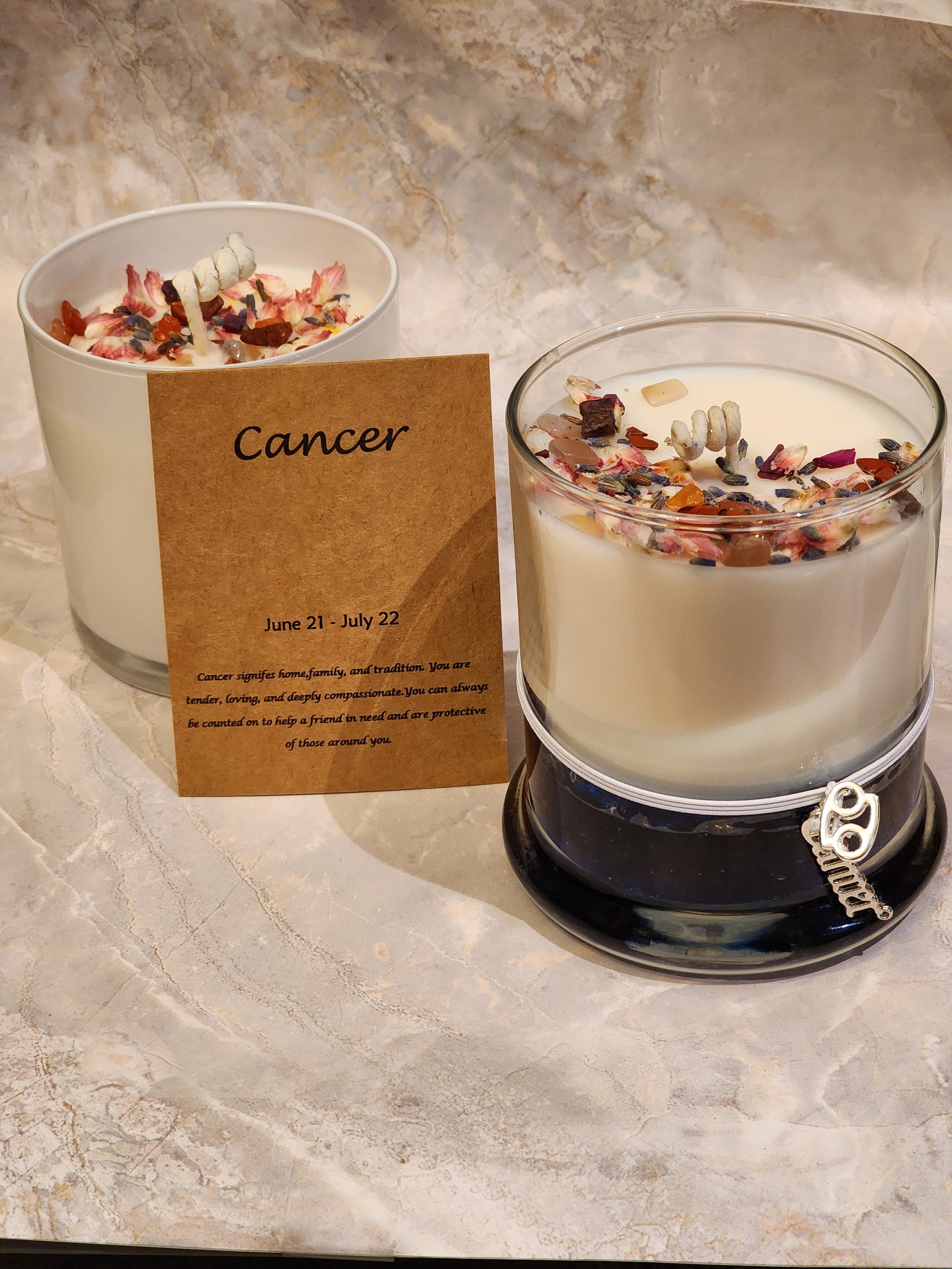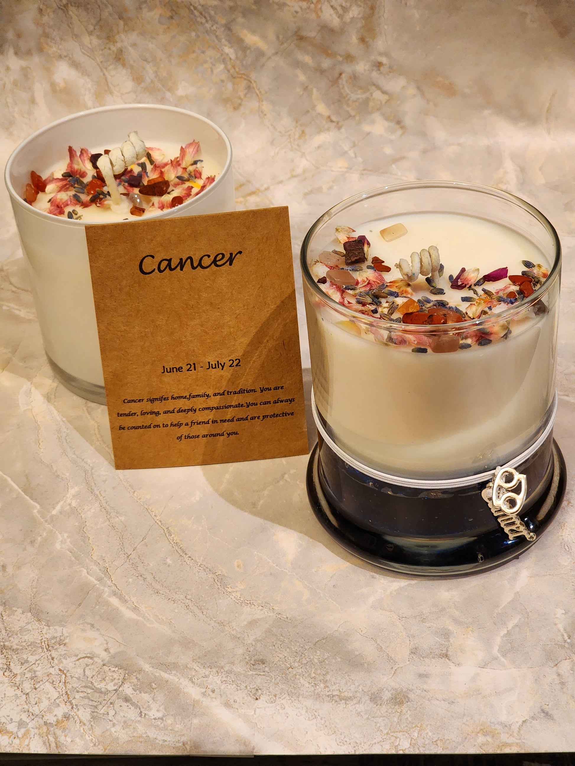 - A soy wax top, adorned with flowers and crystals specific to each zodiac sign.